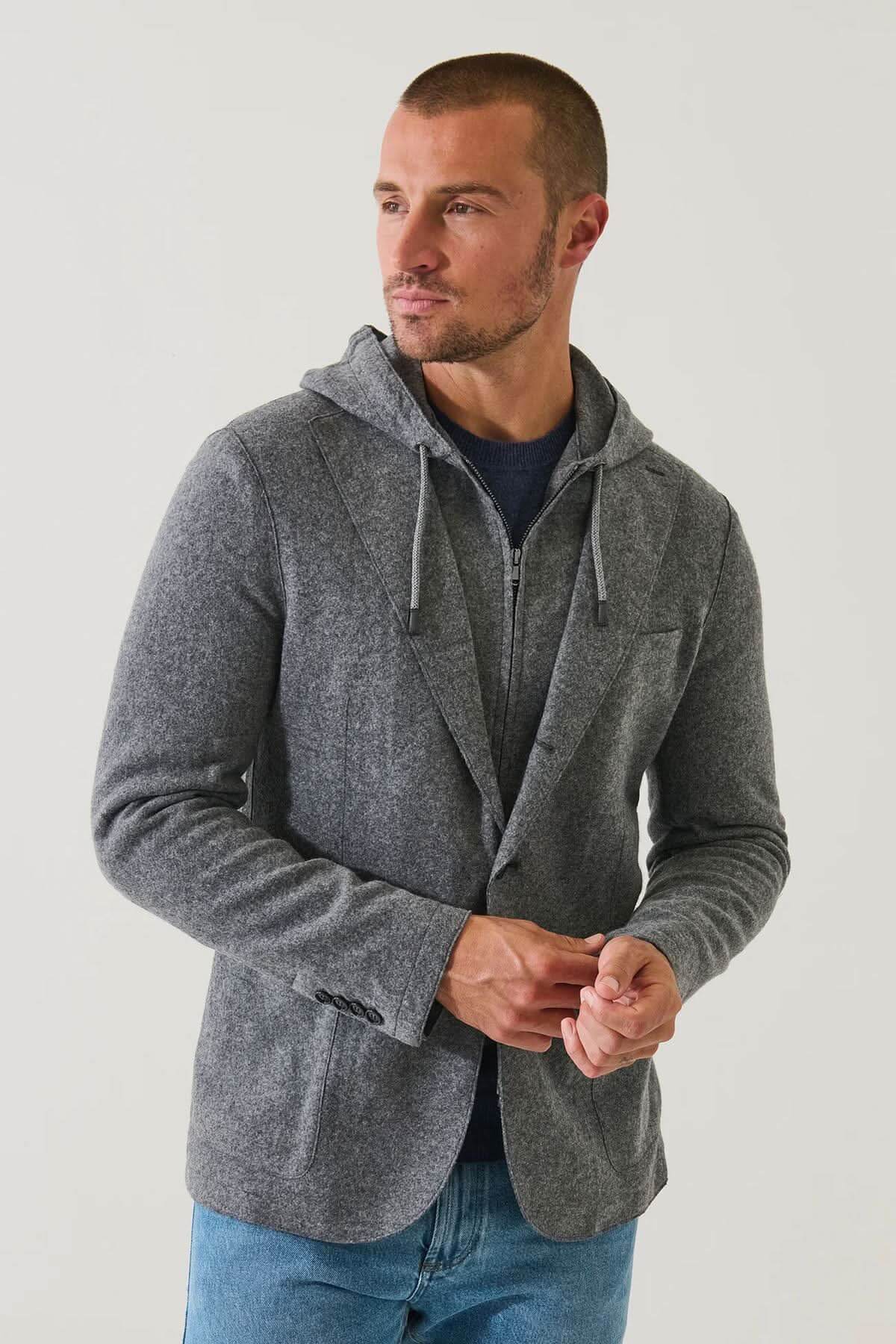 Description: Confectionné en Italie, ce veston à capuche avec gilet amovible revisite le blazer classique dans une version moderne et audacieuse. Son design avec plastron et capuche intégrée lui confère une allure sportive, tandis que sa laine texturée et volumineuse offre confort et élégance décontractée. Une pièce polyvalente qui rehausse instantanément les looks de saison.