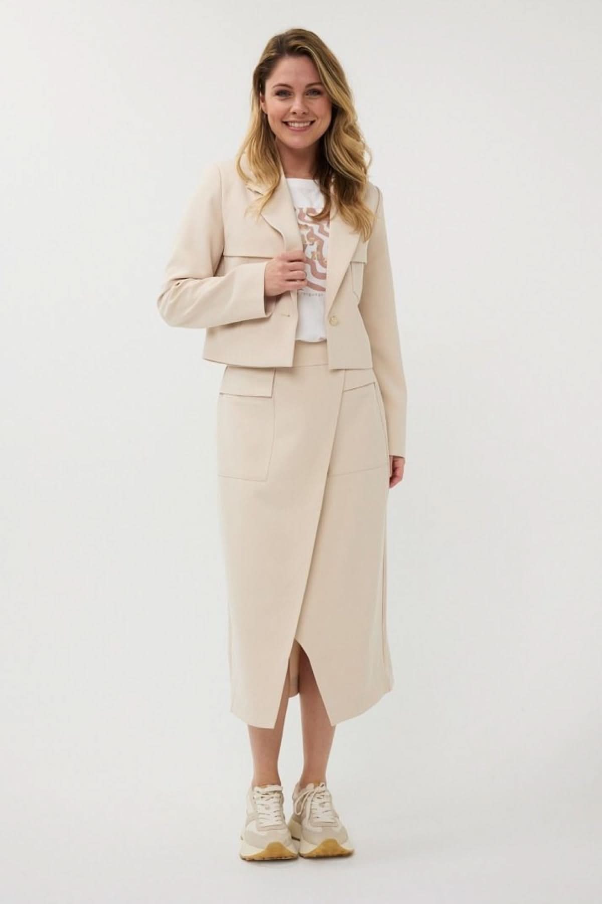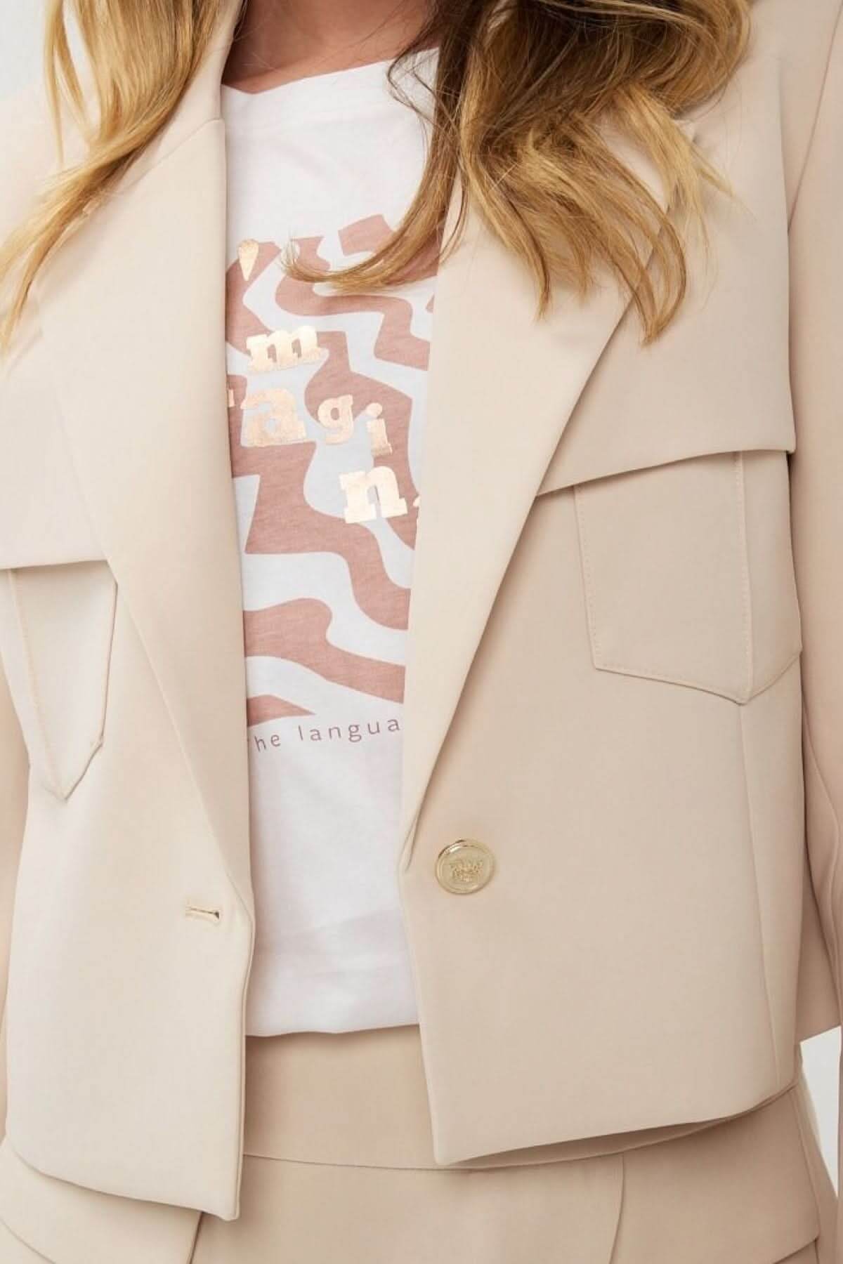 Ce veston court structuré revisite l’esprit tailleur avec une touche moderne et féminine. Doté de poches à rabat surdimensionnées et d’un bouton doré emblématique, il se porte aussi bien sur un t-shirt graphique que sur une blouse raffinée. Une pièce forte à intégrer à votre vestiaire de mi-saison.